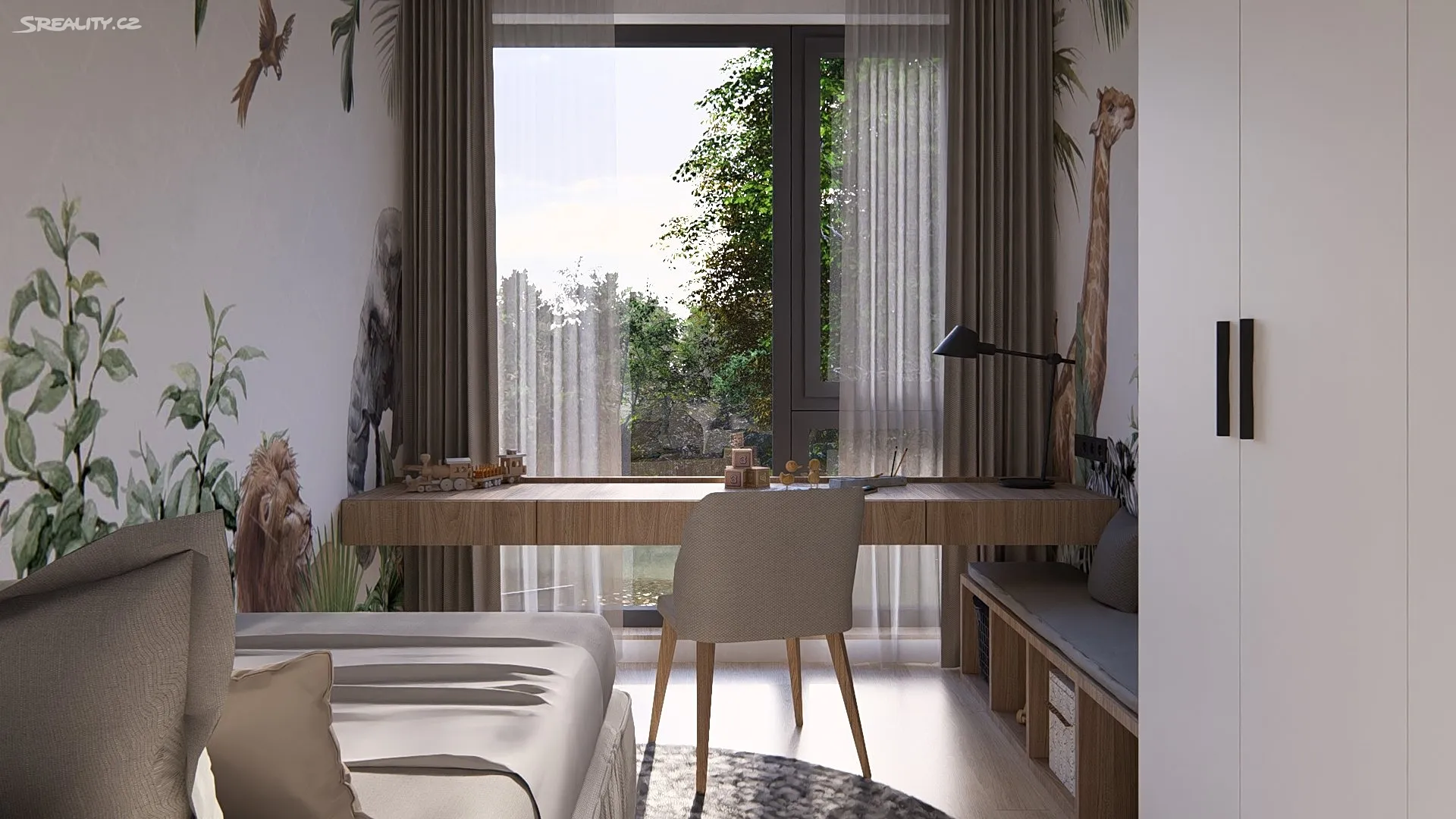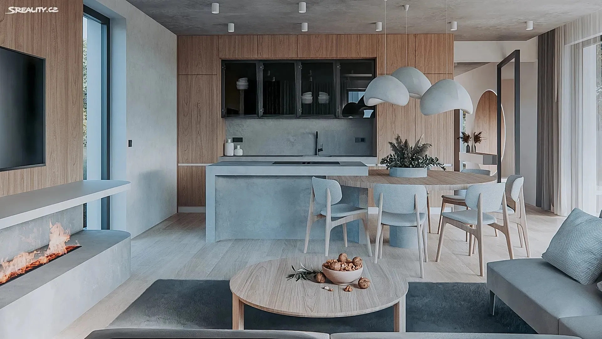Hlavní obytná část domu tvoří obývací pokoj s kuchyní o ploše 41 m², který je díky velkoformátovým oknům přirozeně prosvětlený. Dispozice kombinuje otevřený společenský prostor s dostatkem soukromí pro jednotlivé členy domácnosti a je vhodná jak pro každodenní rodinný provoz, tak pro návštěvy. V 1. patře je situována klidová část domu: hlavní ložnice s vlastní koupelnou a dále dva dětské pokoje s druhou koupelnou. Patro nabízí komfortní uspořádání pro rodinu s jasným oddělením soukromé části. Lokalita a občanská vybavenost Újezd u Průhonic patří mezi vyhledávané rezidenční oblasti díky kombinaci klidu, zeleně a rychlé dostupnosti do Prahy.